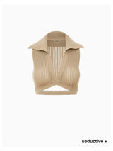Il colletto oversize si ripiega sulle spalle, mentre un taglio lascia intravedere la parte bassa della schiena.