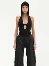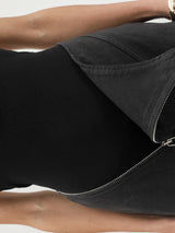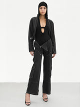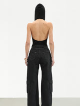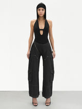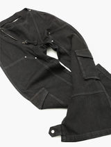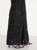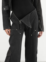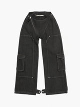 The KORL modern cargo pants in black-wash denim feature multiple pockets, knee patches, and silver-tone hardware. RUVE design statement V-shaped waistline flatters your figure and include a diagonal zip opening.