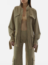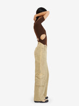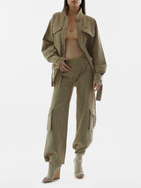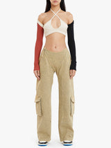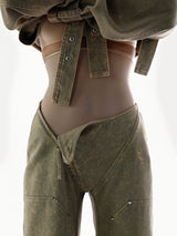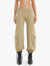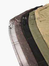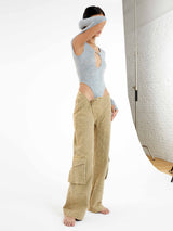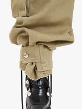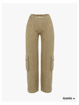 KORL modern cargo pants come in a beautiful overdyed wash denim, multi pockets, and knee patch adorned with silver-tone hardware. The flattering v shape waist pattern creates a polished look and features a zip closure.